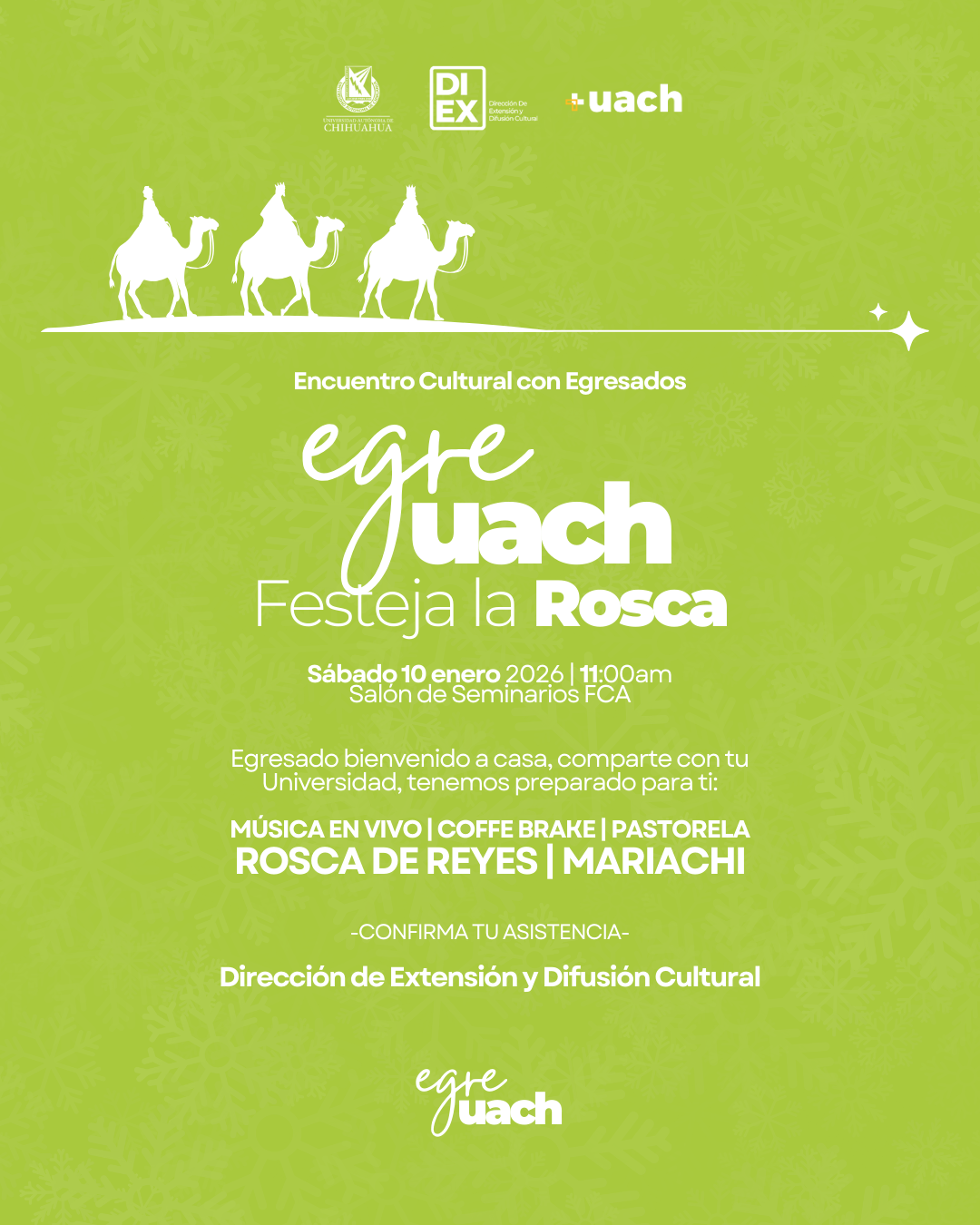 La Universidad Autónoma de Chihuahua a través de la Dirección de Extensión y Difusión Cultural tiene a bien realizar el Encuentro Cultural “EgreUach Festeja la Rosca”, con el propósito de estrechar lazos y fortalecer el sentido de identidad y pertenencia entre los egresados y su Alma Mater.